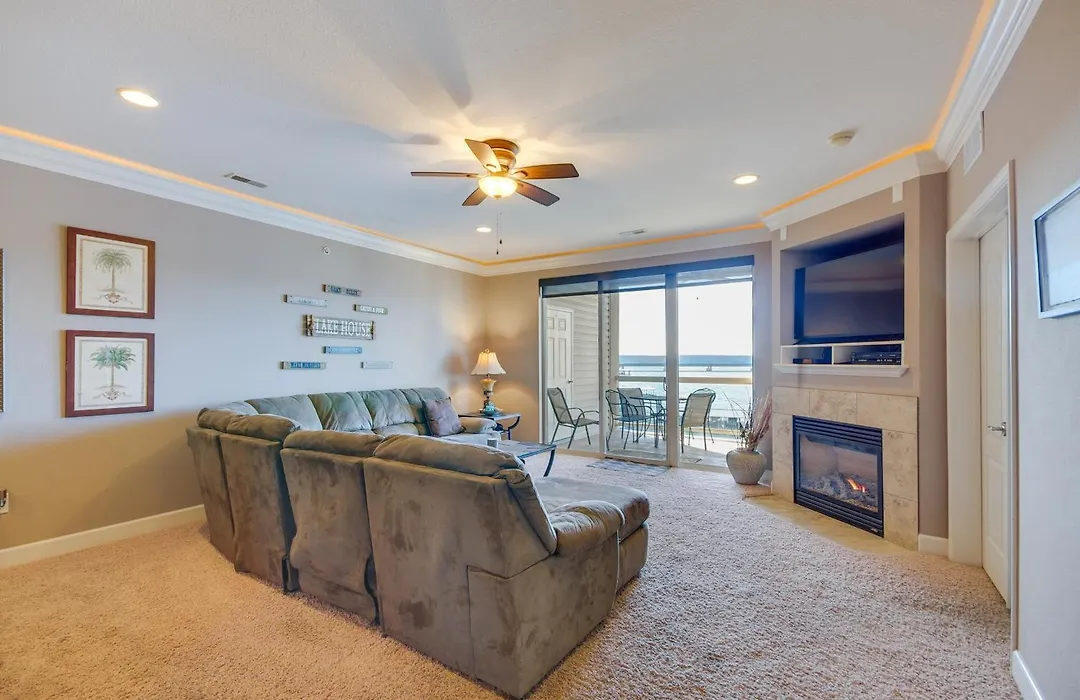 Waterfront Osage Beach Condo With Patio And Grill is furnished with a work desk featuring an iron and ironing board, and climate control, as well as modern facilities like Wi-Fi and a television. Along with lake views, guests will also appreciate a stone fireplace, which enhance the overall experience. The accommodation includes a bathtub, a separate toilet, and a shower for your comfort. Furthermore, hairdryers and bath sheets is available.